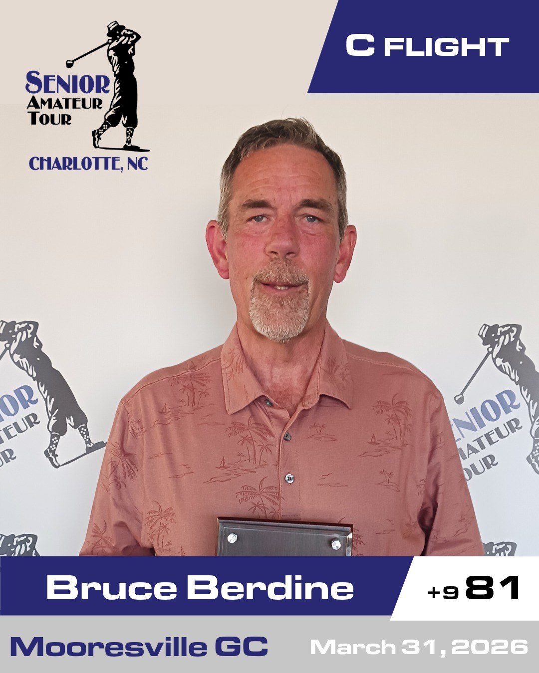 | Bruce Berdine breaks through in his 4 appearance of the year and clears the C Flight field by 3 strokes to take the trophy and winnings. Bruce's round was fueled by 2 birdies on the day as he carded a low round of 81. He vaults up the season leader board to 2nd place and is in position to take a run at the C Flight title. |
