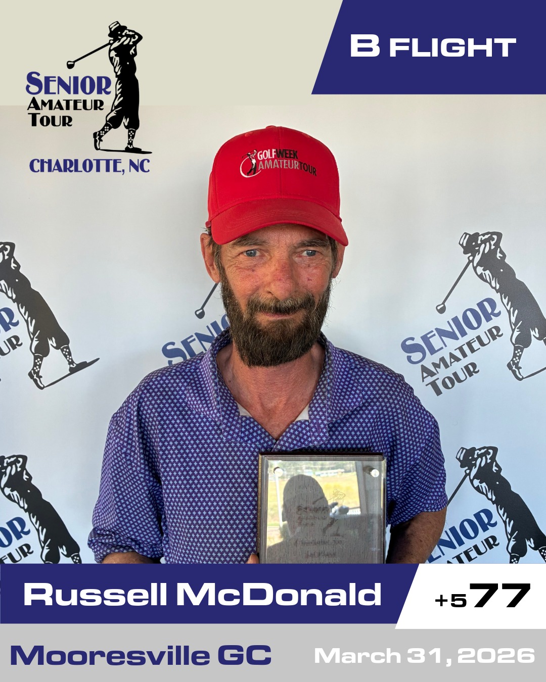 B Flight super weight - @Russell McDonald breaks through on the Senior tour for his first win of the season. Russ has been a factor on the Golfweek tour this season and makes his presence known on the SR Tour with a solid 77 to edge out a packed field by just one stroke. Russell carded two birdies on the day to take the trophy and payout. |