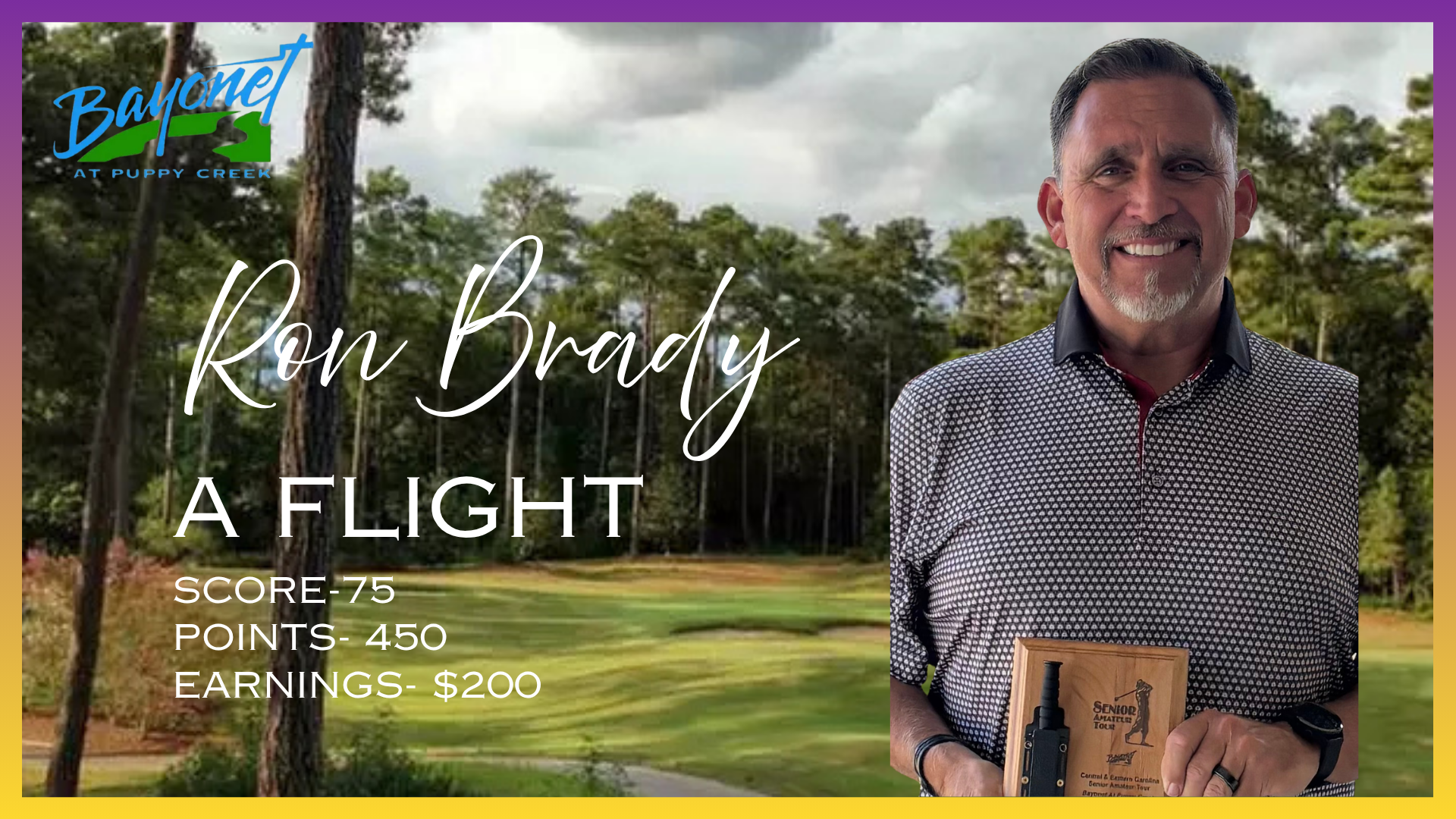 Despite the cooler temps, Ron Brady started out hot in the A flight and stayed that way to the end finishing with a round of two under par 70. Outstanding golf Ron! Johnny Sears finished in second with his score of 73, as Jay Yergeau and Mike Atwood ended the round T3 with a pair of 75’s. Fifth place also was a tie with Courtney Messingham from the Eastern NC Tour and Les Rand recording identical scores of 76.