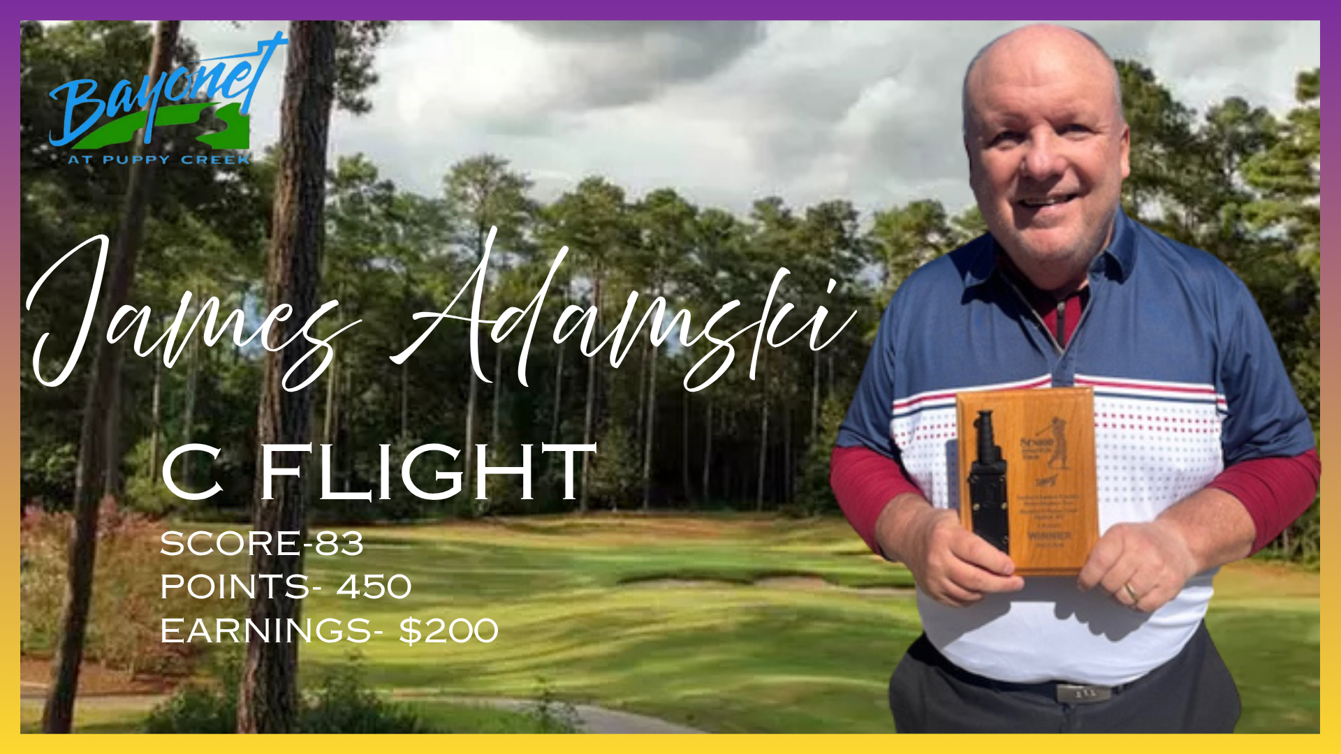Eighteen holes of golf failed to produce an outright winner in the C flight Thursday. So James Adamski, and Dallas Shackleford from the Eastern NC Tour with matching scores of 83, proceeded back to hole one for a sudden victory playoff required by Tour Manual. James and Dallas matched scores on the first hole so the playoff continued on. The second hole was as far as the playoff would go as James’s bogey was just good enough to capture the win. Awesome golf James! Dallas was the obvious runner up. Third place was a T3 as Trevor Horne and Corey McGee, both from the Eastern NC Tour, shot identical 85’s. Thomas Bullock and Glenn Lewis, again both from the Eastern Tour, matched scores of 86. And seventh place was again a tie with Davie Smith from the Eastern Tour and Mike Groom both turning in 87 to the scoring table.