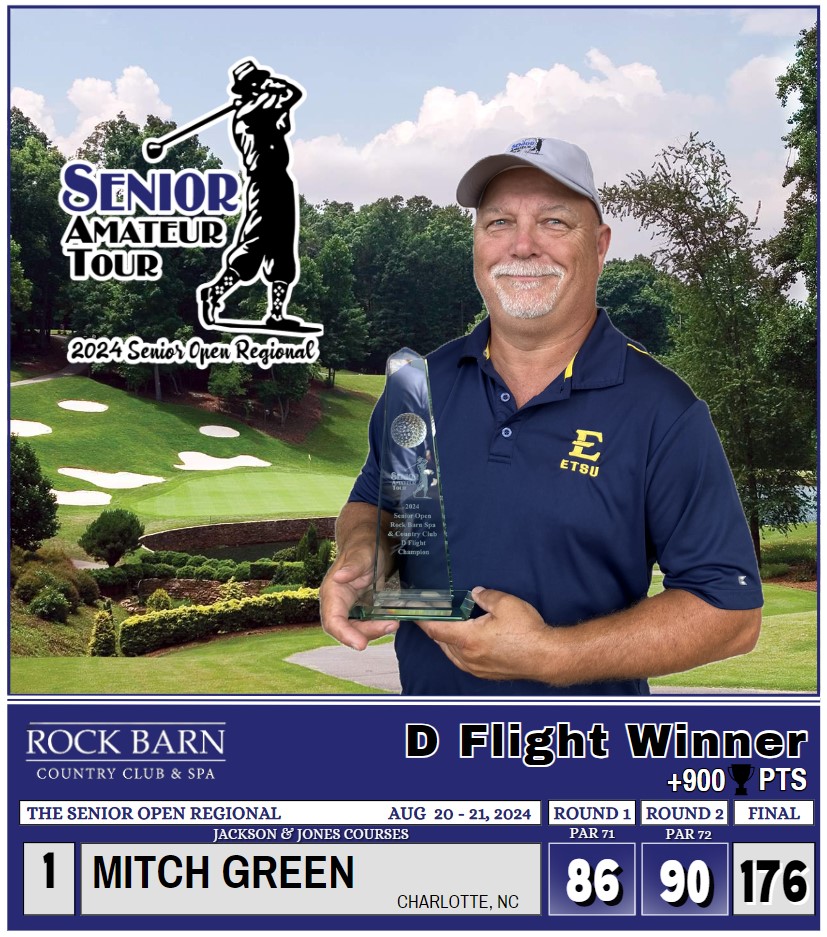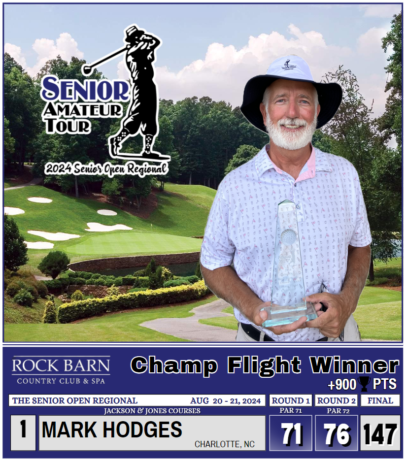 The last Senior Amateur Tour Regional for the 2024 season was contested at the beautiful yet difficult Rock Barn Golf and Country Club in Conover, NC. Featuring two courses named for their architects, the par 71 Jackson Course tested the field on Day One. The Final Day was played under unusually cool temps for an August day in North Carolina on the challenging par 72 Jones Course.