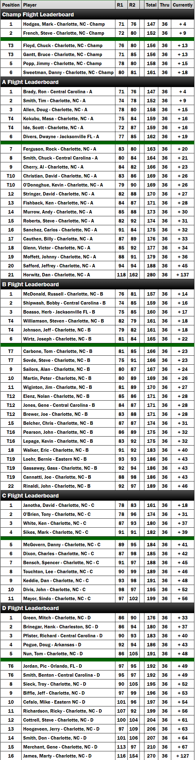 Champ Flight members, Mark Hodges (Charlotte, NC) and overall season points leader, Bruce Gantt (Charlotte, NC), was tied both carding 71 after the first round. The field fell away from Hodges on Day 2 and cruised to an unchallenged 5 stroke lead for the double points and the trophy.
