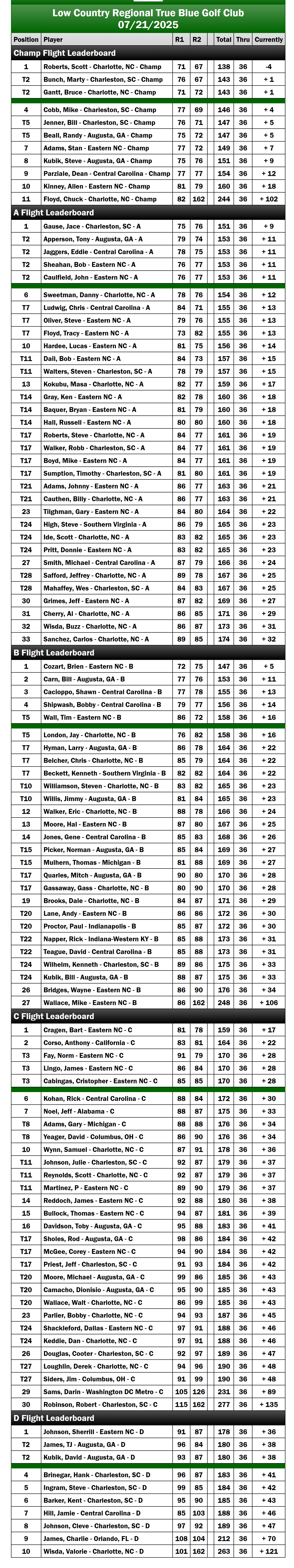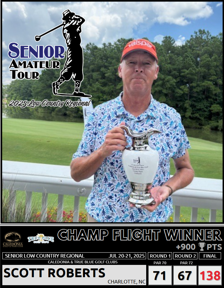 In the Champ Flight, both Scott Roberts (Charlotte, NC) and Bruce Gant (Charlotte, NC) finished Day One at one over par at Caledonia. However, on Day Two, Roberts and Marty Bunch (Charleston, SC) delivered impressive performances, each recording rounds of five under par (67). This outstanding play secured Roberts the victory and elevated Bunch to second place. Gant managed to maintain his position in third place with an even par round of 72.