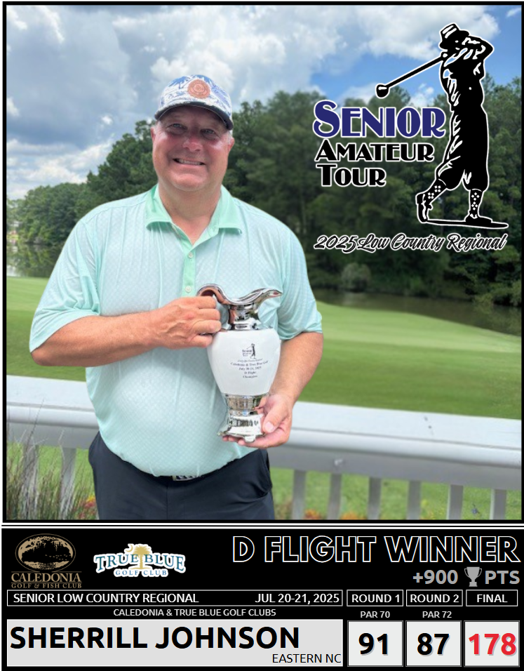 We also want to congratulate Allen Kinney (Eastern NC), the winner of our V Foundation raffle, who has earned a brand-new Srixon ZXi Driver which was donated by Srixon, one of our Tour Sponsor’s. $505 was raised at the Senior Low Country Regional.